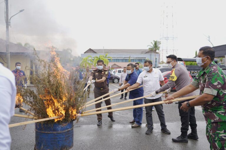 Pidie – Polres Pidie Polda Aceh kembali menunjukkan komitmennya dalam memerangi narkotika dengan memusnahkan barang bukti sabu-sabu seberat 6 kg dan 1.475 batang ganja di Mapolres Pidie, Rabu (18/9/2024). Pemusnahan tersebut dilakukan langsung oleh Kapolres Pidie, AKBP Jaka Mulyana SIK MIK, bersama sejumlah pejabat daerah, termasuk perwakilan BNK Pidie, Kejaksaan Negeri, serta Dinas Kesehatan dan Dinas Sosial.