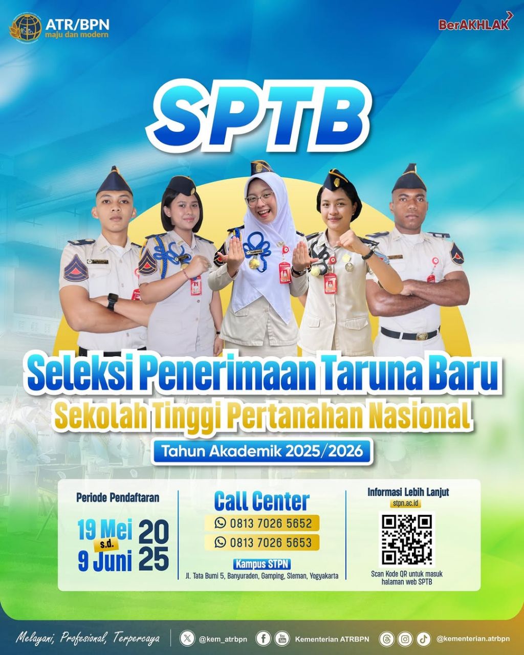 YOGYAKARTA — Sekolah Tinggi Pertanahan Nasional (STPN) kembali membuka pendaftaran Seleksi Penerimaan Taruna Baru (SPTB) untuk Tahun Akademik 2025/2026. Proses pendaftaran dilakukan secara daring mulai 19 Mei hingga 9 Juni 2025 melalui laman https://penerimaan.stpn.ac.id.