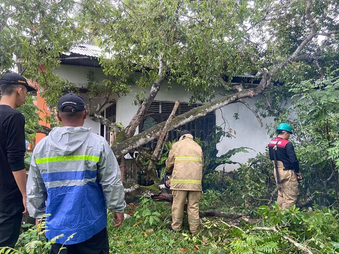 JANTHO – Angin kencang disertai hujan di Aceh Besar sejak siang menjelang sore, membuat pohon tumbang menimpa atap rumah di Desa Sibreh Keumudee, Kecamatan Suka Makmur, Musibah ini terjadi Minggu (22/6/2025).