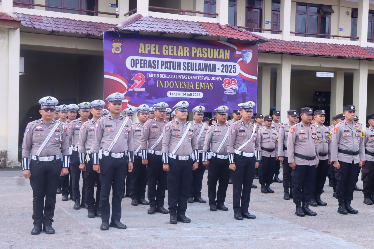 Langsa – Apel Gelar Pasukan Operasi Patuh Seulawah 2025 resmi digelar di halaman Mapolres Langsa, Senin (14/7/2025) pagi. Kegiatan dimulai sekitar pukul 08.30 WIB dengan Inspektur Apel Kapolres Langsa AKBP Mughi Prasetyo Habrianto, S.I.K.
