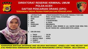 Direktorat Reserse Kriminal Umum (Ditreskrimum) Polda Aceh menetapkan Shinta Astuti (34), warga Komplek Avina Residen III, Langsa, sebagai daftar pencarian orang (DPO) dalam kasus dugaan investasi bodong bernilai miliaran rupiah.