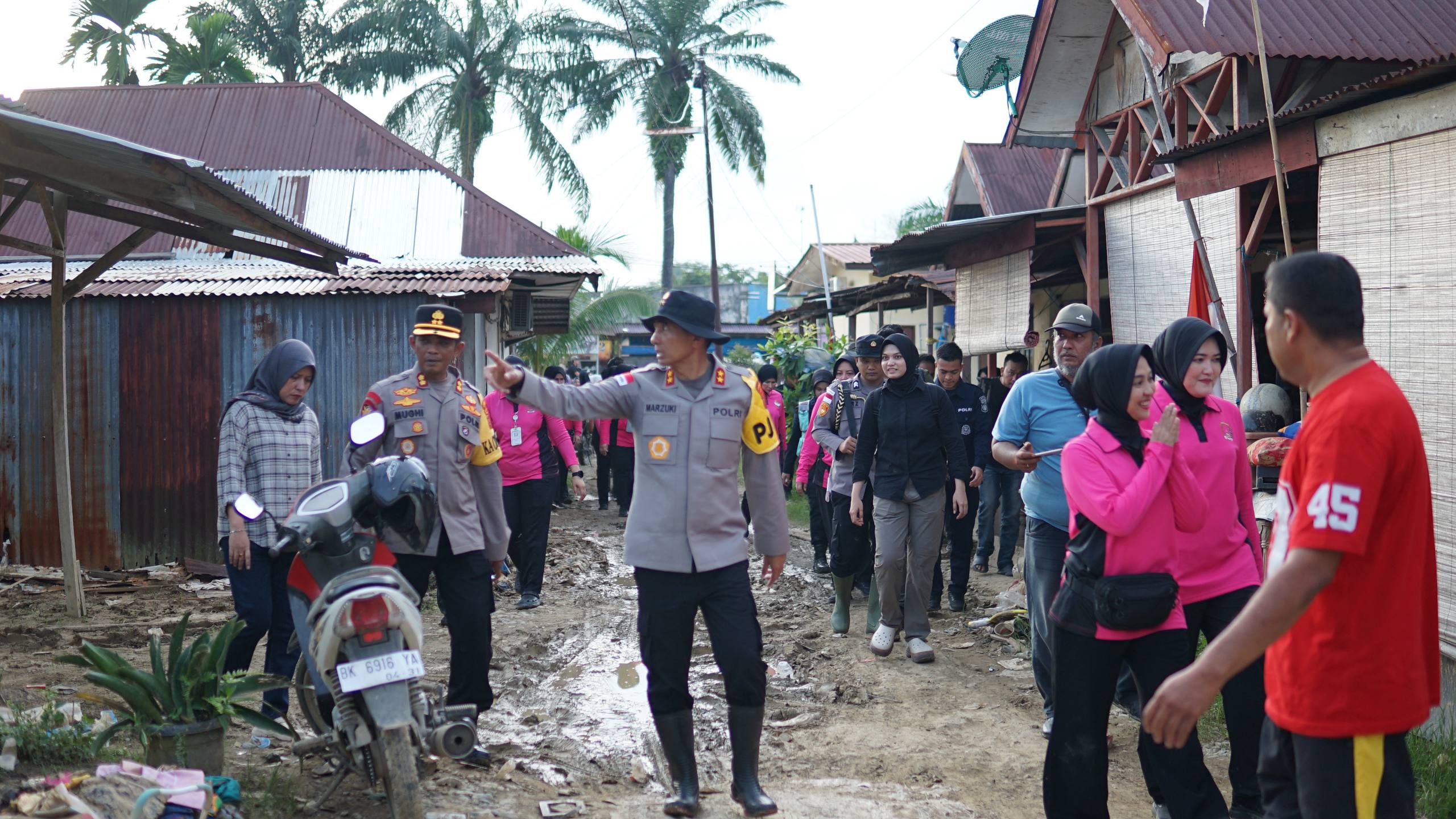Langsa – Kepolisian Daerah Aceh menunjukkan komitmen dan kepedulian nyata terhadap wilayah yang terdampak bencana alam. Kapolda Aceh Irjen Pol. Drs. Marzuki Ali Basyah, M.M., didampingi Ketua Bhayangkari Daerah Aceh Ny. Ira Marzuki, melaksanakan kunjungan kerja ke wilayah hukum Polres Langsa dalam rangka pemantauan kondisi pasca banjir yang melanda Kota Langsa, Minggu (21/12/2025).