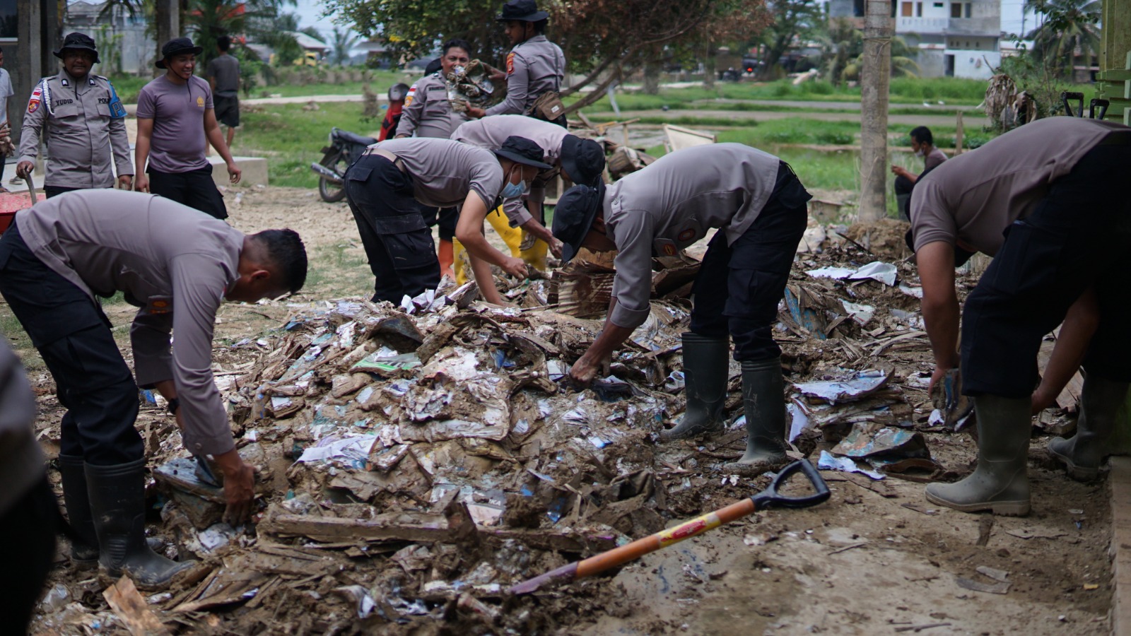 Dengan mengenakan seragam dinas, para personel tampak sigap memilah dan mengangkat buku-buku yang tertimbun lumpur. Sebagian buku yang masih bisa diselamatkan dipisahkan, sementara yang rusak parah dikumpulkan untuk dibuang. Proses pembersihan dilakukan secara gotong royong bersama pihak sekolah dan masyarakat setempat.